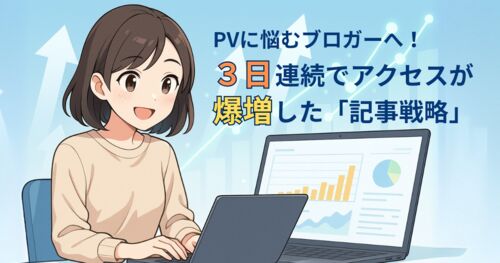 0→1万→2万PV:コツコツ続けた先に「一気に伸びる瞬間」がきた この記事は、私自身のブログ成長体験をもとに書いています。最初はPVゼロの日々が続いても、ある日突然PVが跳ね上がる──そんな実体験をシェアし、今まさに頑張っている初心者ブロガーさんを応援…